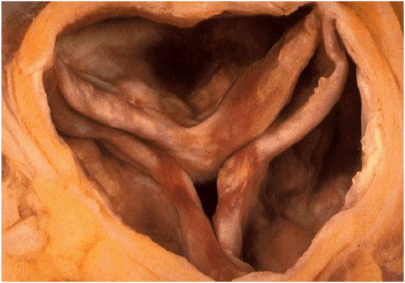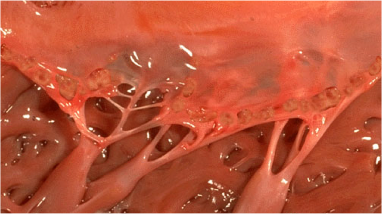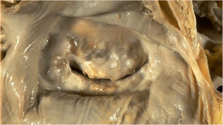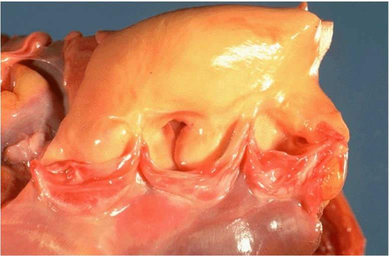 mechanism: Valves have “osteoblast like cells” that cause the deposition of calcium. Ca++ is made inside the fibroelastic tissue of the valve.