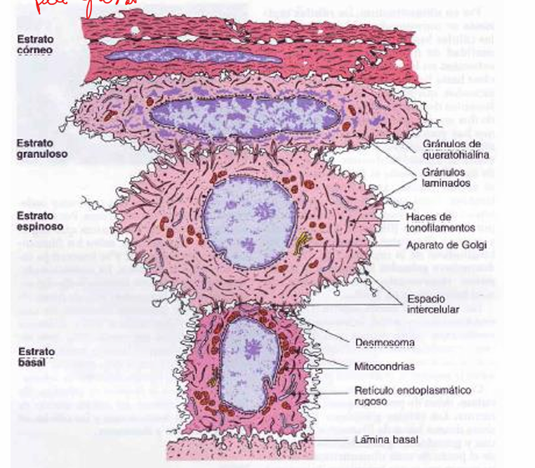* Estrato espinoso:- Células con forma poligonal, núcleos