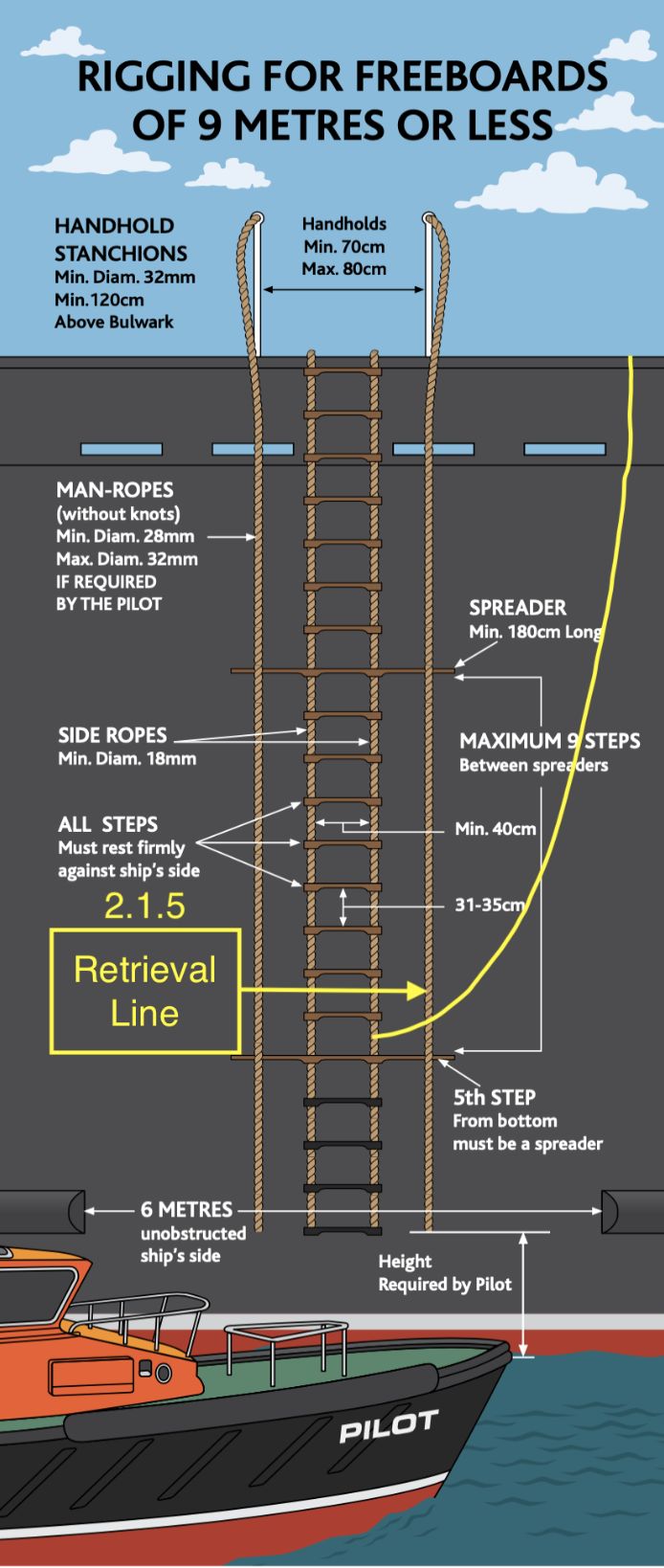 What are the pilot ladder requirements for a freeboard of less than 9 metres?