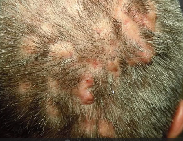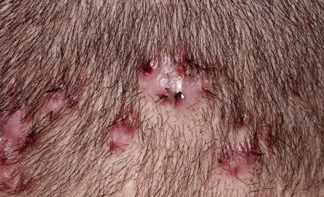 Múltiplos nódulos inflamatórios fistulizantes–> alopecia cicatrial de couro cabeludo