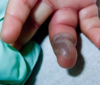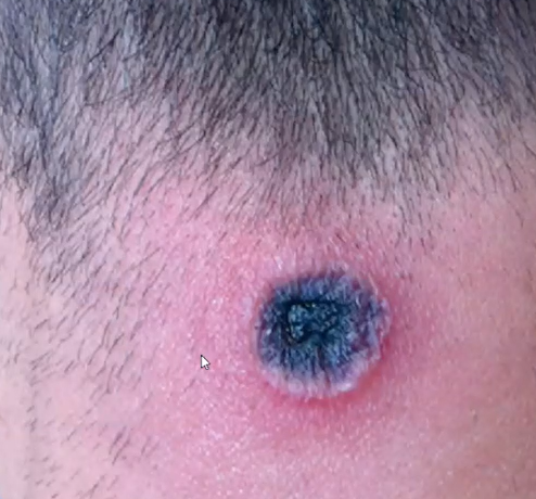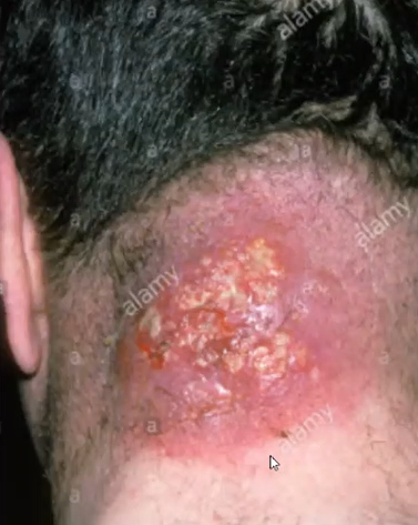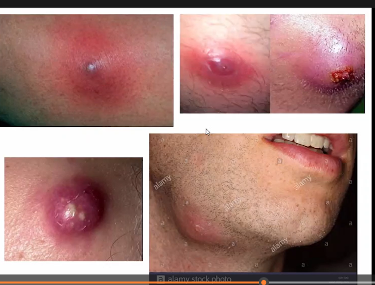 Nódulo doloroso com eritema local. Pustula com área de necrose (carnegão)