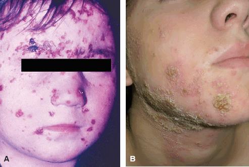 Lesões atingem a face (região perioral e nariz) > pode acometer tronco, membros em número variável.