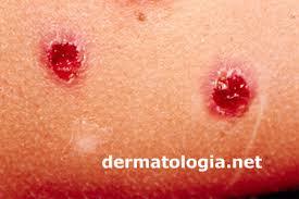 > Máxima eritematosa> evolui rapidamente bolha e / ou vesícula efetiva de paredes finas> crosta reduzida é espessa e amarelada.