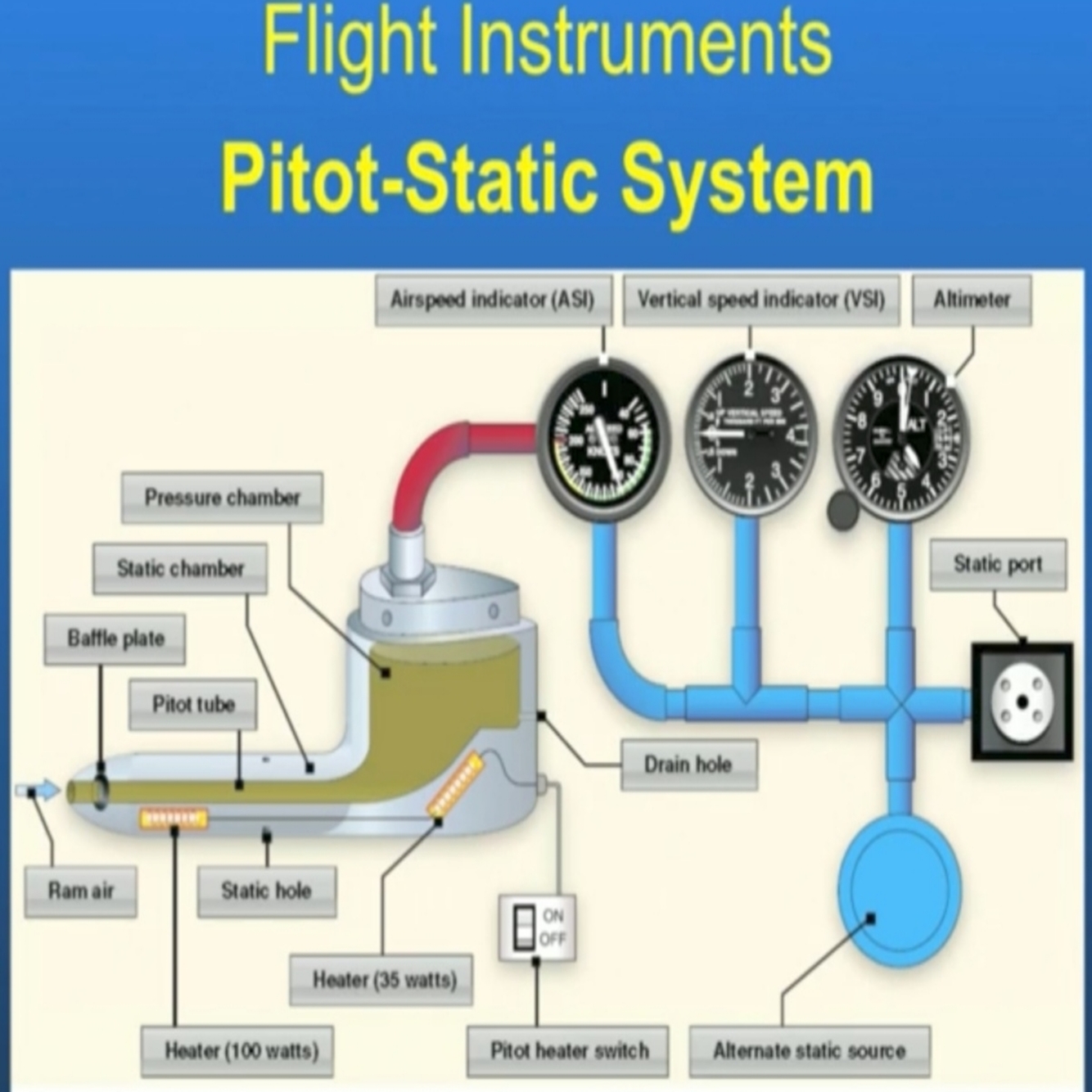 A Pitot-Static system is, at it’s core, a pressure measuring system. Below is a basic diagram.