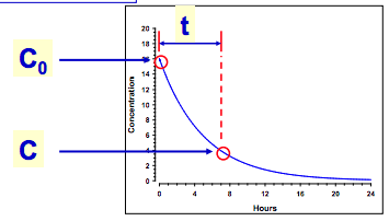 > start: 100 mg → 80 mg (1 hr) → 64 mg (2 hr) → 51 mg (3 hr) → 41 mg (4 hr) etc.