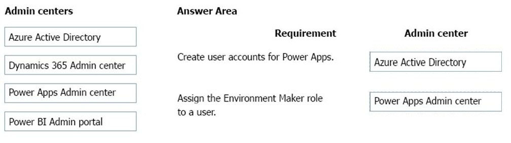Which admin centers should you use? To answer, drag the appropriate admin centers to the correct requirements. Each admin center may be used once, more than once, or not at all. You may need to drag the split bar between panes or scroll to view content.