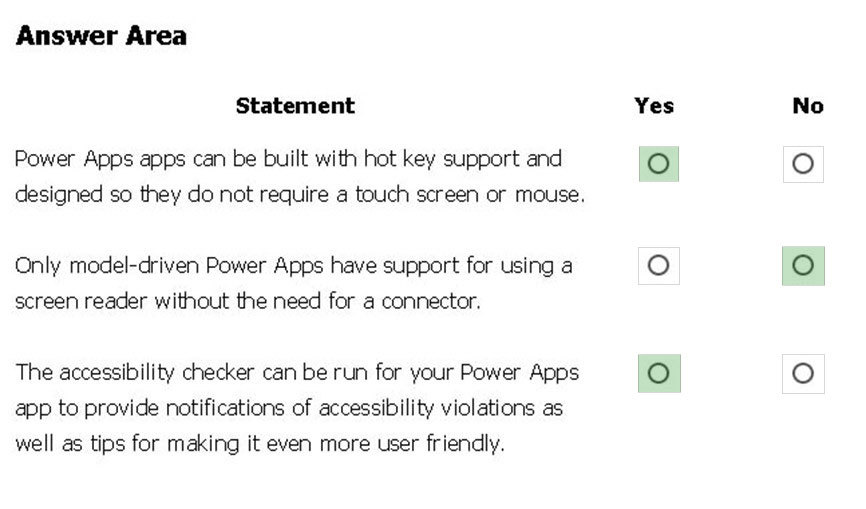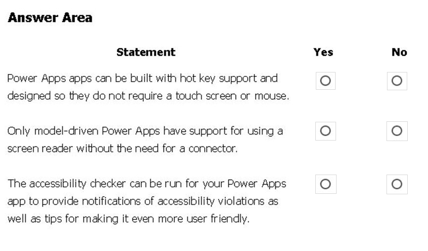You are creating a model-driven Power Apps app. You want to ensure that the app can be used by individuals who have vision impairments.