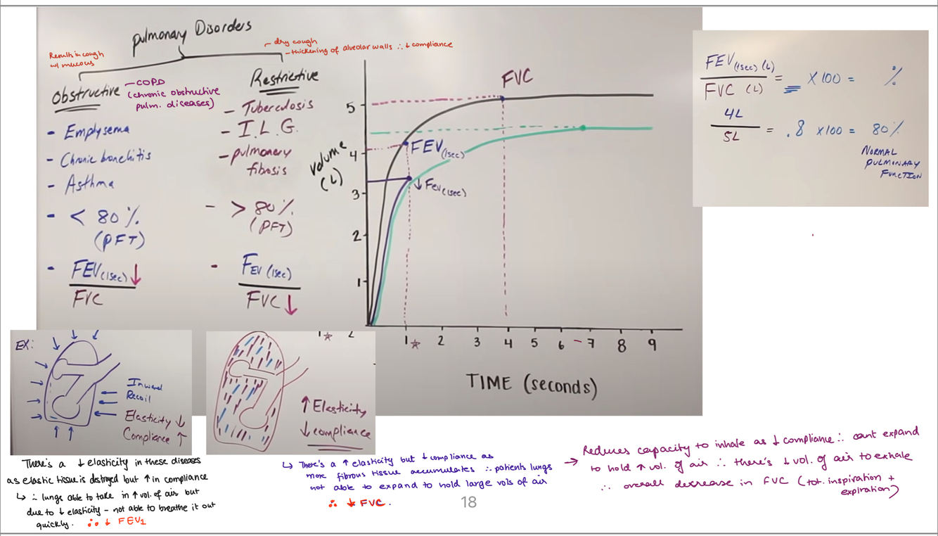 Obstructive – COPD (chronic bronchitis, emphysema), asthma – arent able to exhale air due to decreased elastic recoil