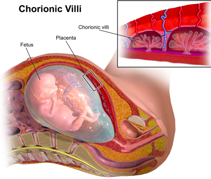 The vessels in the villi connect to the umbilical vessels carrying blood to and from the fetus.