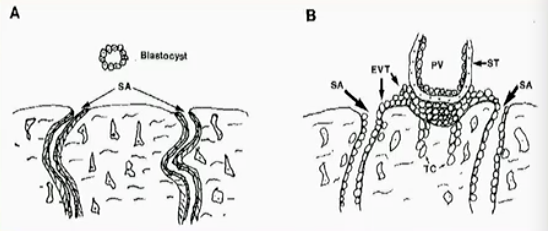Extravillous trophoblasts (EVT) have broken through the syncitiotrophoblast layer of the placental villous and have invaded into the spiral arteries of the uterus.