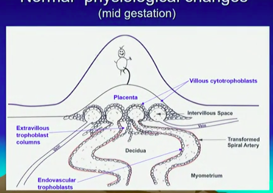 What are the normal physiological changes occuring mid gestation in the placenta?