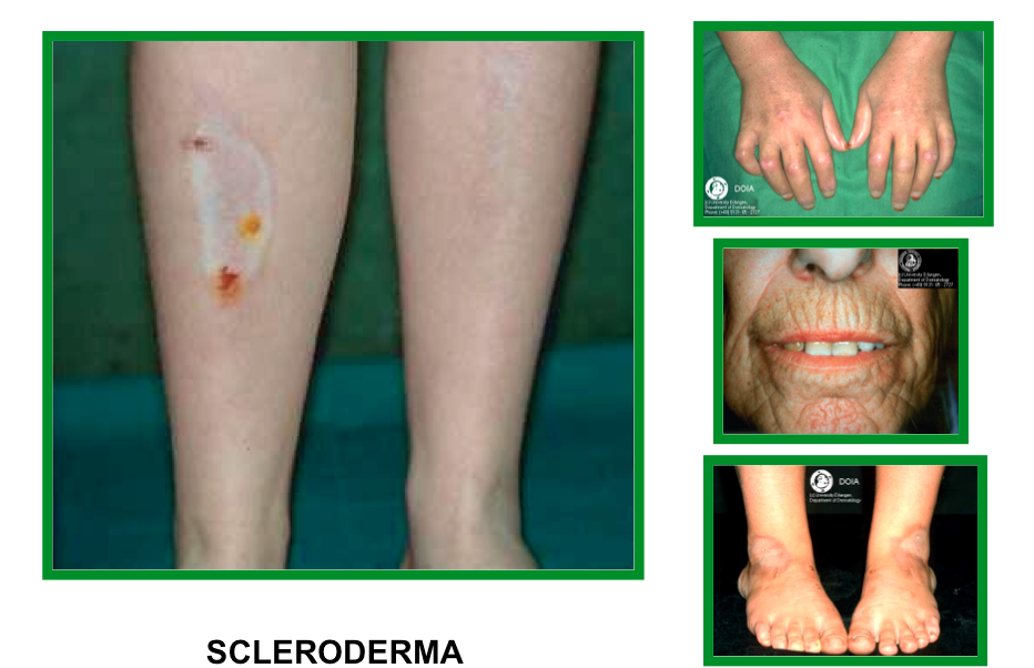 scleroderma – excess CT, hard skin, taut skin can restrict movement