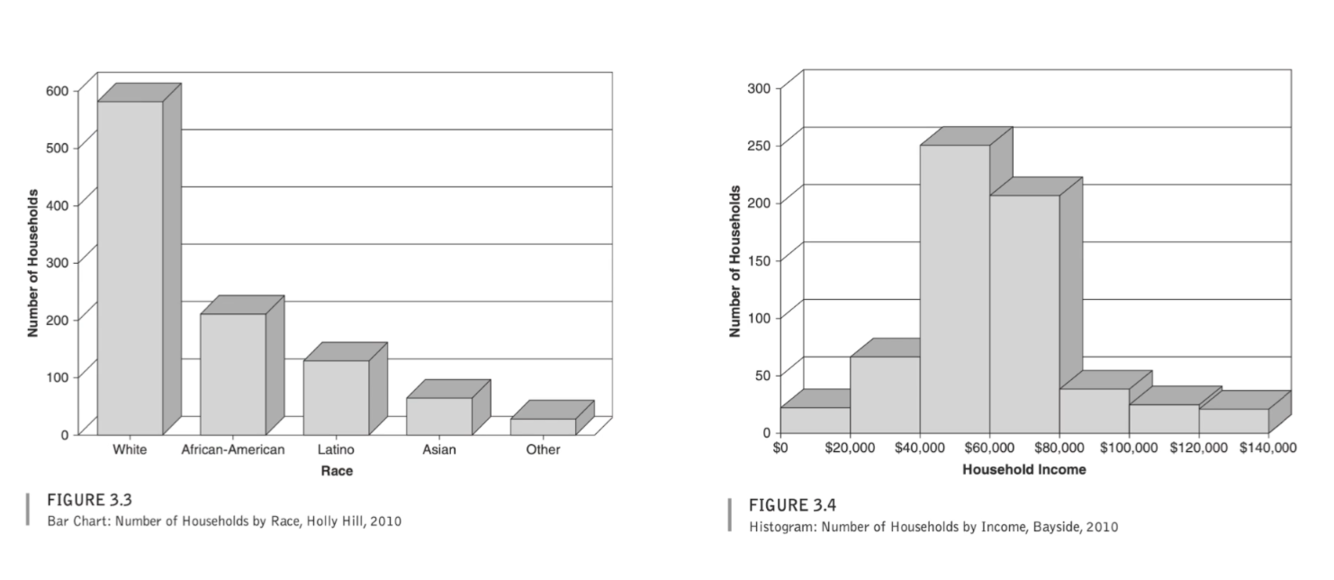A bar chart has distinct groups (eg. race) while a histogram has continuous categories (eg. income)