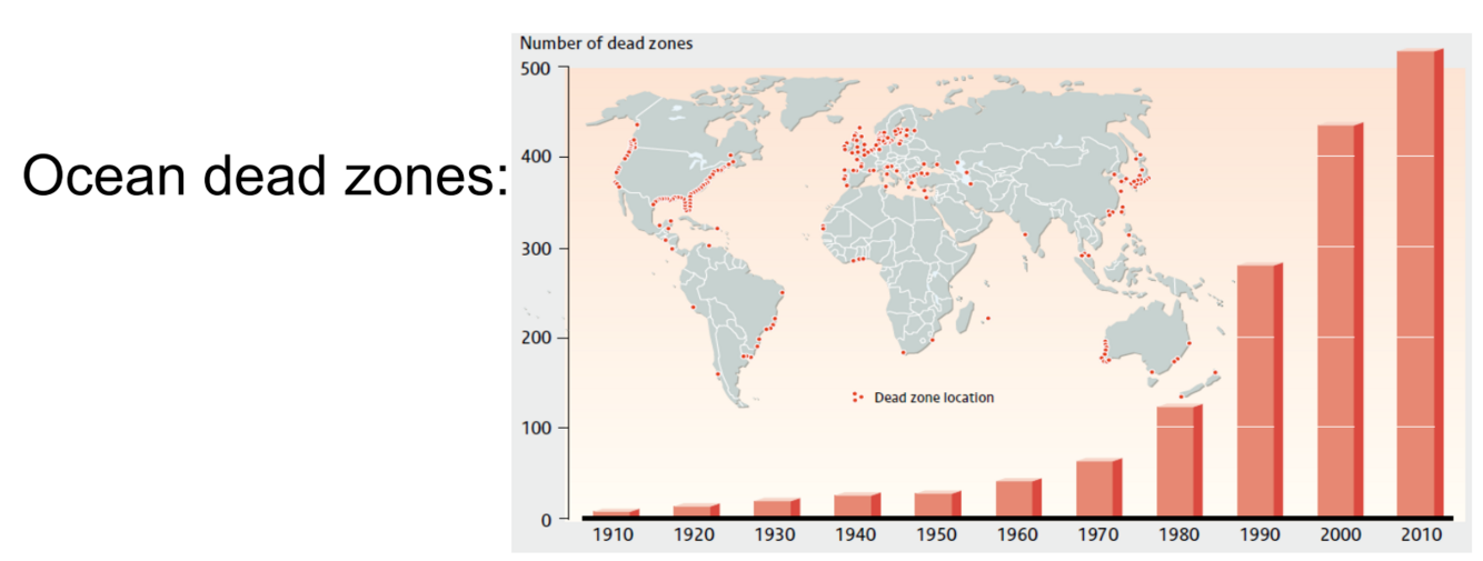 Nitrous oxide (N2O) and phosphorous are used for fertilizers in agriculture and can shift the state of lake and marine ecosystems from clear to turbid water and low levels of oxygen which can kill the fish.