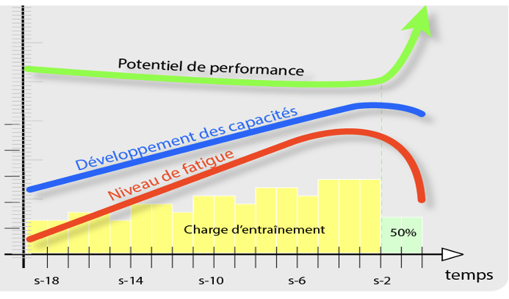 * Performance va aug drastiquement => phénomène physiologique = surcompensation ; capacité de mon corps vont se multiplier grâce au repos => Lors du repos, le corps fini par se préparer pour un autre stress d’entraînent