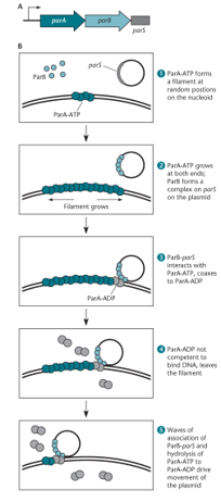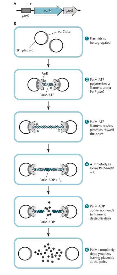 ParM forms a complex with ATP to push the plasmids to opposing poles