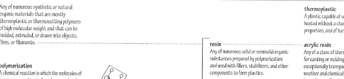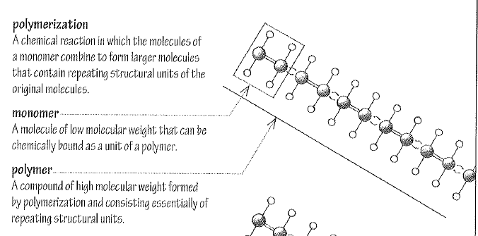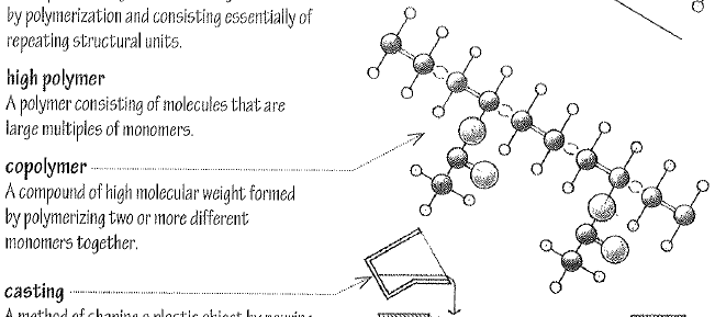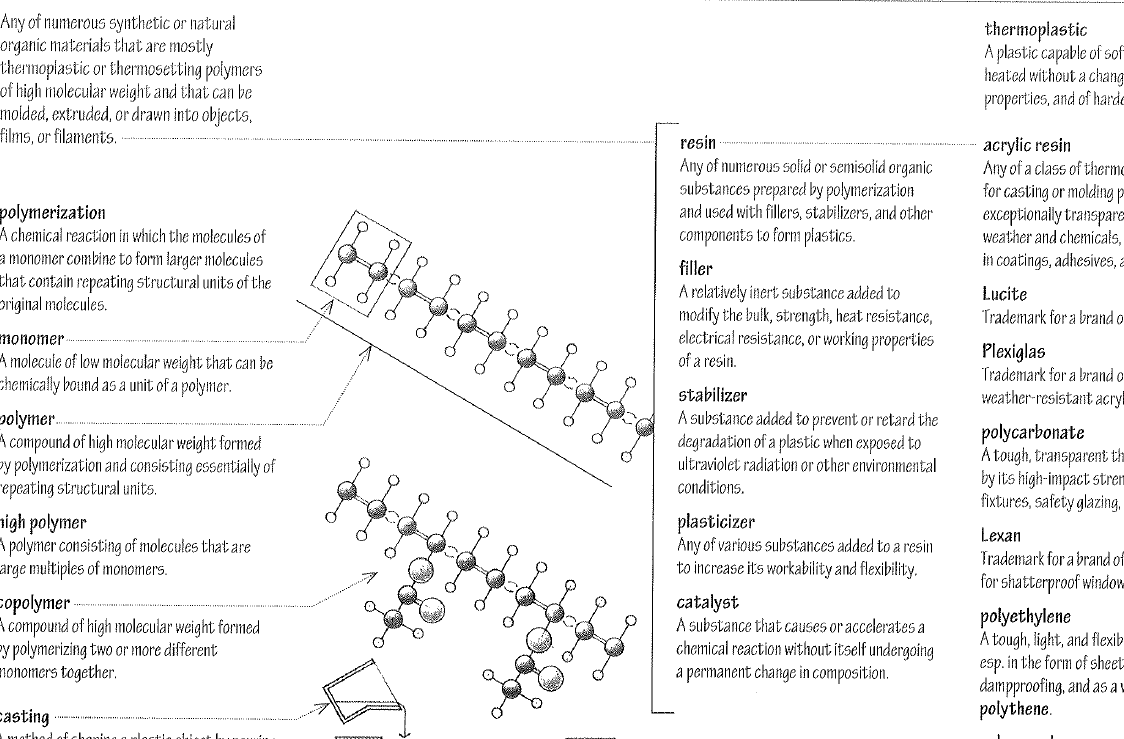 Any of numeros solid or semisolid organic substances prepared by polymerization and used with fillers, stabilizers and other components to form plastics.