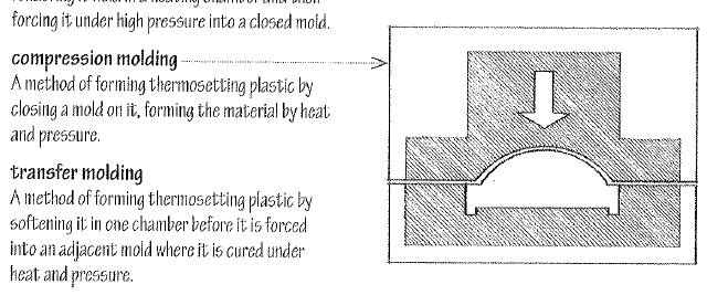 A method of forming thermosetting plastic by cloasing a mold on it, forming the material by heat and pressure.