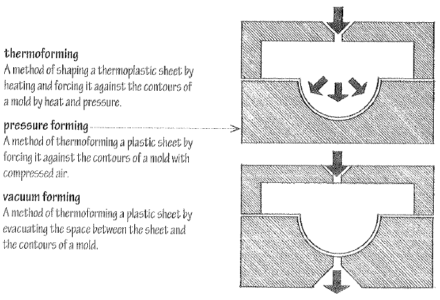 A method of shaping a thermoplastic sheet by heating and forcing it against the contours of a mold by heat and pressure.