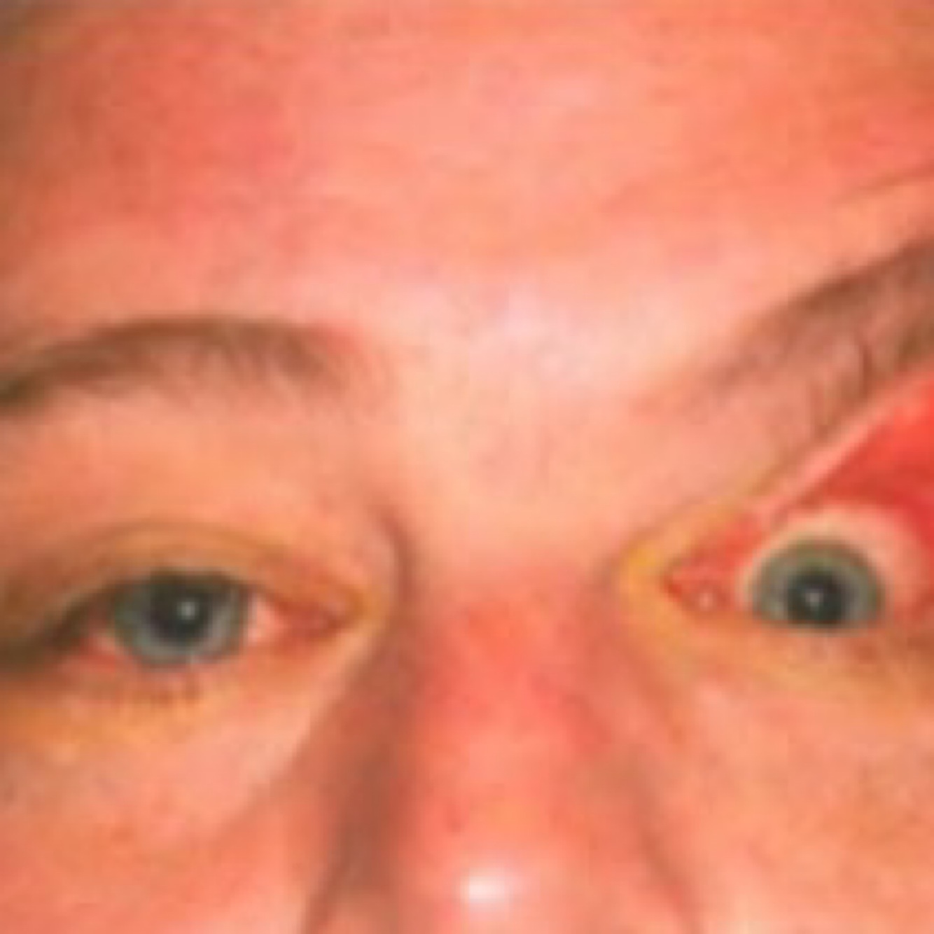 Na alternativa A podemos observar a descrição de mucocele, que foi inserida na questão para confundir o candidato. Trata-se da formação de cistos intrassinusais expansivos, que ocorrem pelo acúmulo de muco no seio paranasal por obstrução do óstio do mesmo. Cursa com proptose e distopia lenta e progressiva, com o surgimento de massa em quadrante nasal superior da órbita, uma vez que a maioria das mucoceles são fronto-etmoidais. Acomete mais frequentemente idosos e diabéticos. Cursa com erosão óssea e o tratamento é eminentemente cirúrgico, com abordagem multidisciplinar com o cirurgião de órbita e otorrinolaringologista.