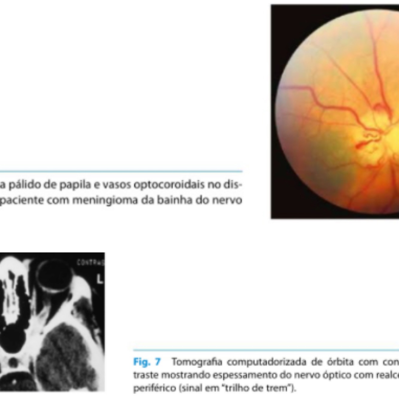 Os meningiomas da bainha do nervo óptico cursam com diminuição lenta e progressiva da acuidade visual, indolor. Ao exame podemos encontrar defeito pupilar aferente e edema do disco óptico (achado precoce) e evoluir tardiamente para atrofia óptica. Outro achado que é cobrado na prova são os shunts optociliares que ocorrem devido a isquemia progressiva no nervo (pode acontecer em outras patologias também como glaucoma e OVCR). Proptose também pode estar presente.