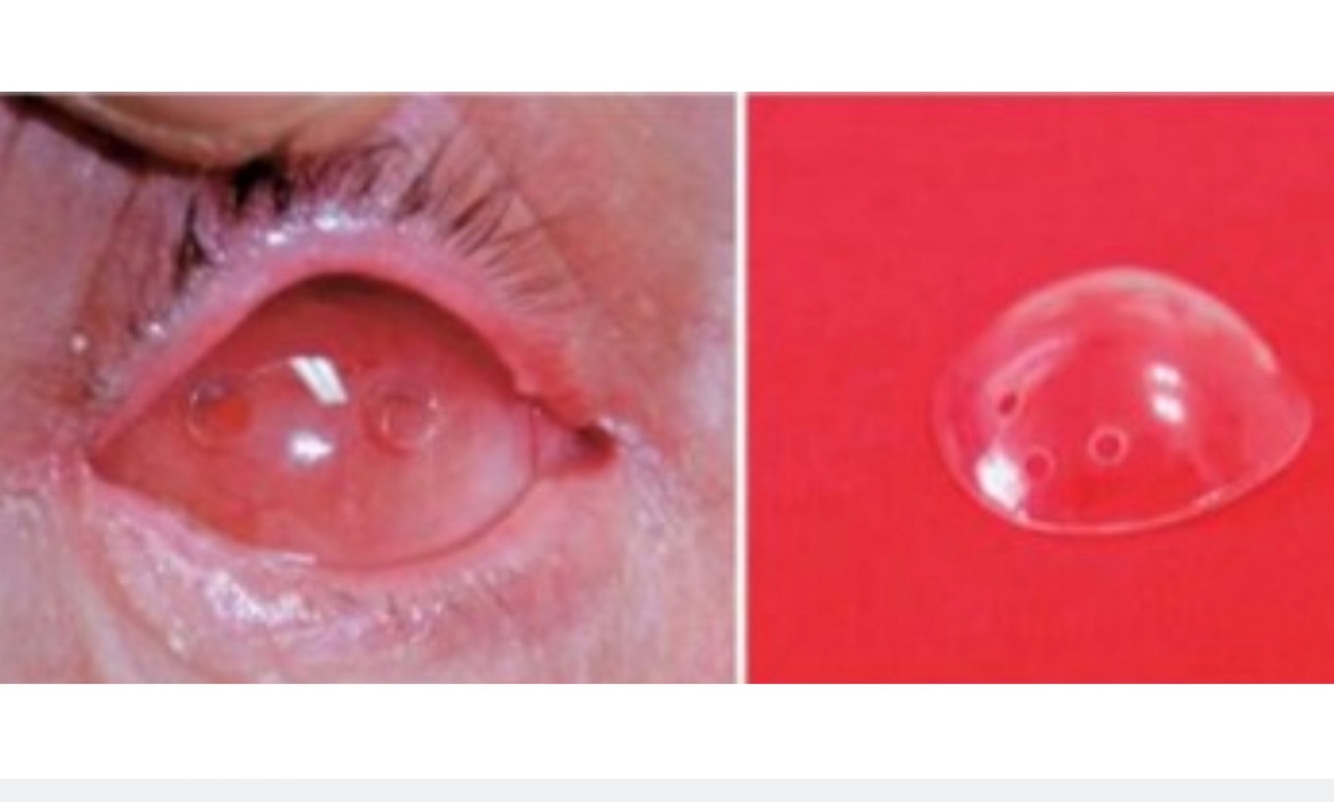 A órtese mostrada na imagem é uma lente de simbléfaro ou conformador. Ela é utilizada no pós-operatório imediato da cirurgia de evisceração ou enucleação para manutenção dos fundos de saco. São necessárias pois após o procedimento cirúrgico, a inflamação local pode fazer com que o tecido conjuntival se retraia com o passar do tempo e resulte em uma cavidade anoftálmica contraída, o que dificultaria a adaptação da prótese externa cosmética.