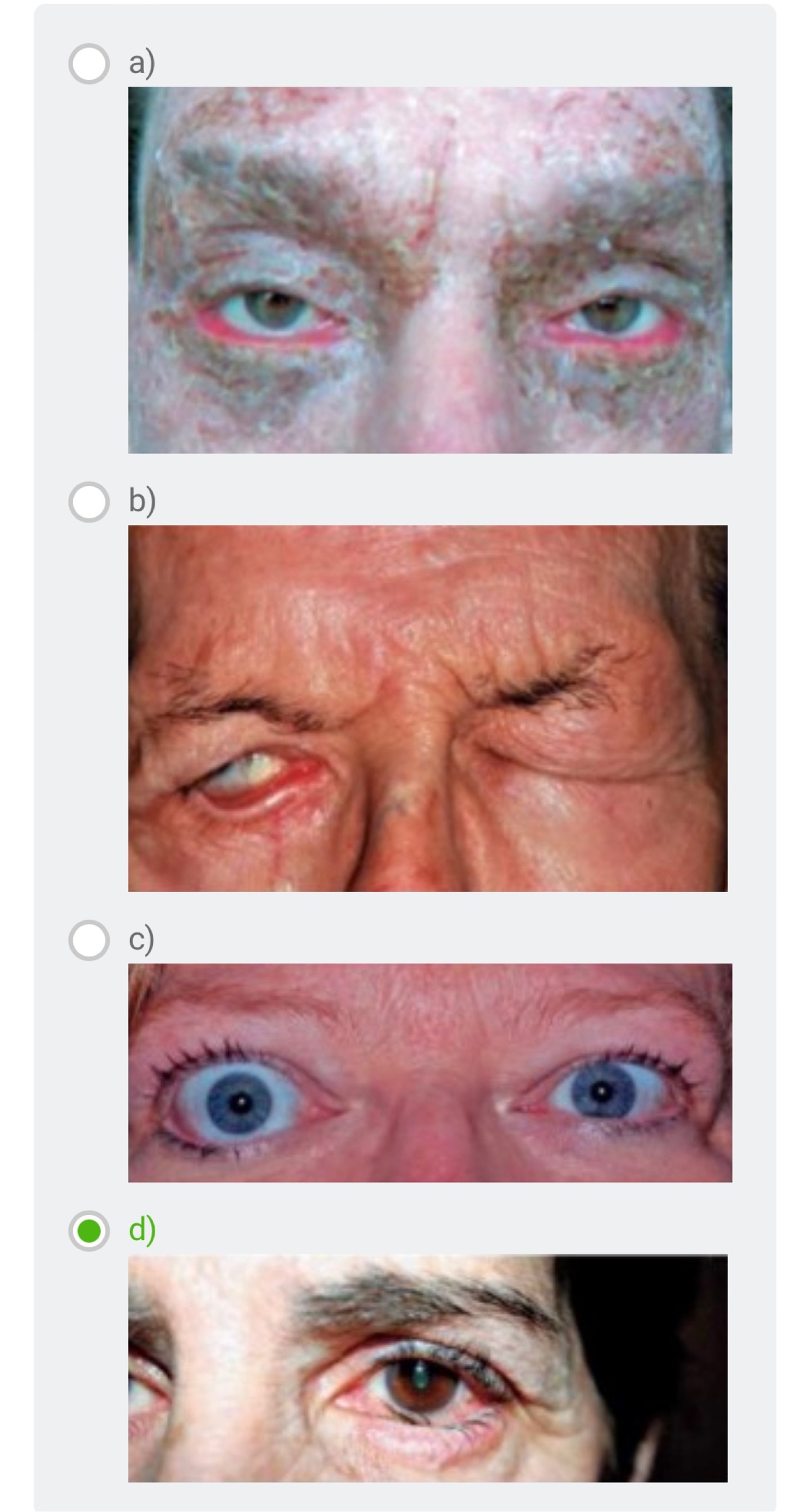 A imagem da alternativa C mostra uma paciente apresentando proptose, retração palpebral superior e inferior em quadro sugestivo de Orbitopatia de Graves. As alterações palpebrais nesse caso ocorrem devido a infiltração inflamatória e contração fibrosa do músculo de Muller e retratores, e também devido ao quadro de proptose. Outra teoria aceita é a presença de uma hiperatividade do músculo de Muller. Um dos tratamentos já na fase crônica é através da desinserção dos retratores em pálpebra inferior, justamente para que a mesma “suba” um pouco, e também pode ser realizada Mullerectomia para que promova uma queda da pálpebra superior