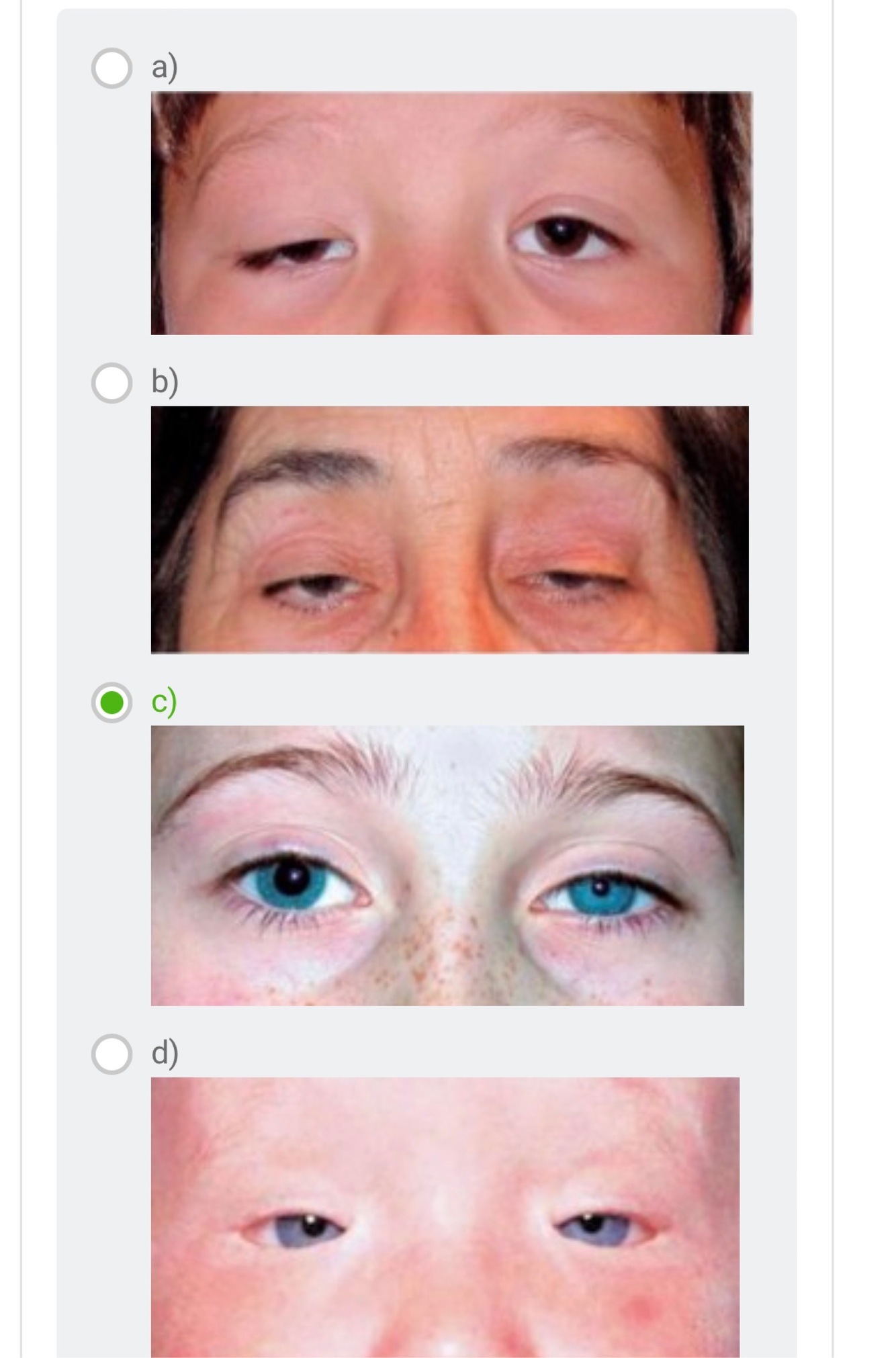 Na alternativa D o candidato pode observar um paciente que apresenta Síndrome de Blefarofimose caracterizada por: telecanto, epicanto inverso, ptose e ectrópio do canto lateral da pálpebra. O tratamento do epicanto inverso é feito com dupla zetaplastia, e o da ptose palpebral através da suspensão do frontal (uma vez que a função do músculo elevador da pálpebra é pobre).