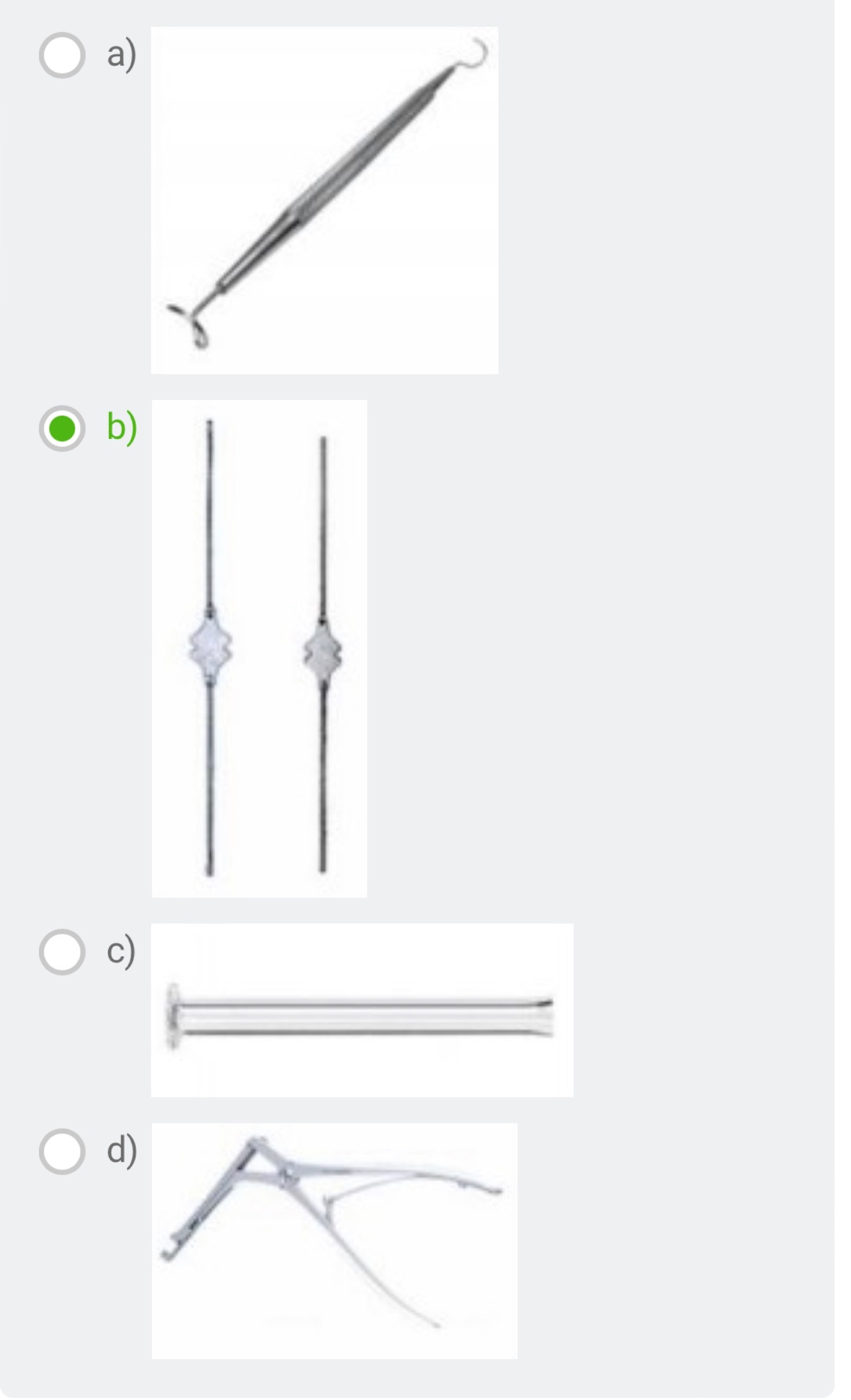 A alternativa B nos fornece uma imagem de duas sondas de Bowman que são utilizadas na propedêutica das vias lacrimais para avaliar se os canalículos lacrimais estão pérvios.