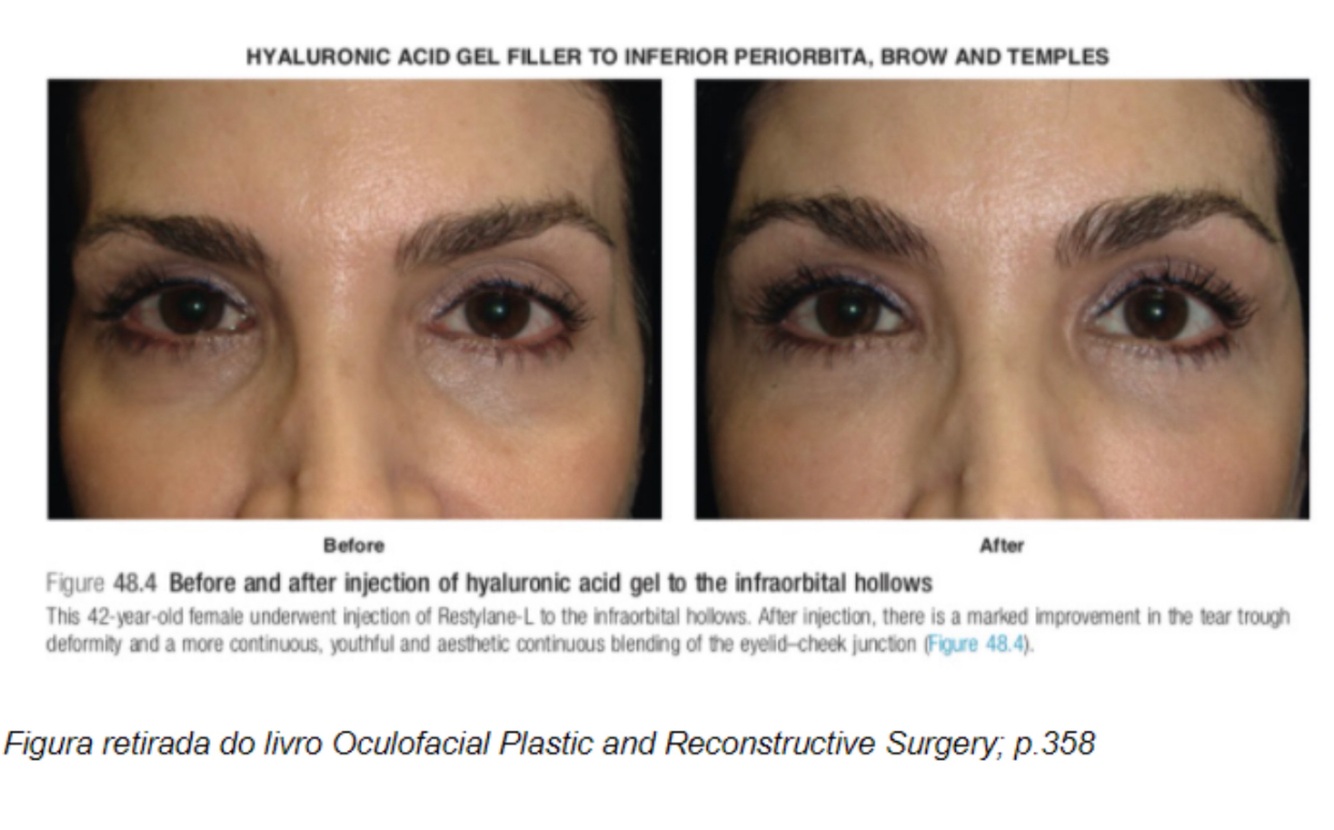 Com o processo de envelhecimento facial, há perda óssea e flacidez generalizada da musculatura, gerando queda do terço médio da face. Nesse processo ocorre o aprofundamento dos sulcos palpebrais (também conhecidos com “tear trough”), evidenciando as bolsas de gordura palpebrais. Além disso, há também a formação de outros sulcos faciais típicos da face envelhecida como o sulco nasojugal e a “linha da marionete”. Para melhora da composição da face o principal produto utilizado para dar firmeza e sustentação à face, além de estimular a produção endógena de colágeno, são os ácidos hialurônicos. Esses produtos permitem o preenchimento dos sulcos amenizando-os e gerando rejuvenescimento facial importante, além de colaborar com o resultado estético da blefaroplastia.