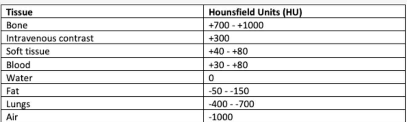 What are the ranges of Hounsfield units for different tissues?