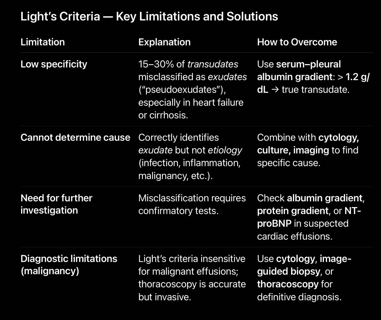 =>Some effusions that are truly transudative can be misclassified as exudative by Light’s criteria eg- heart failure pts on diuretics.