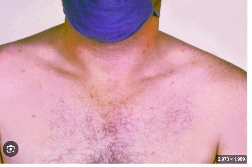 A patinet has returned from his travels and comes to you because hes worried about spots that have developed on his chest.