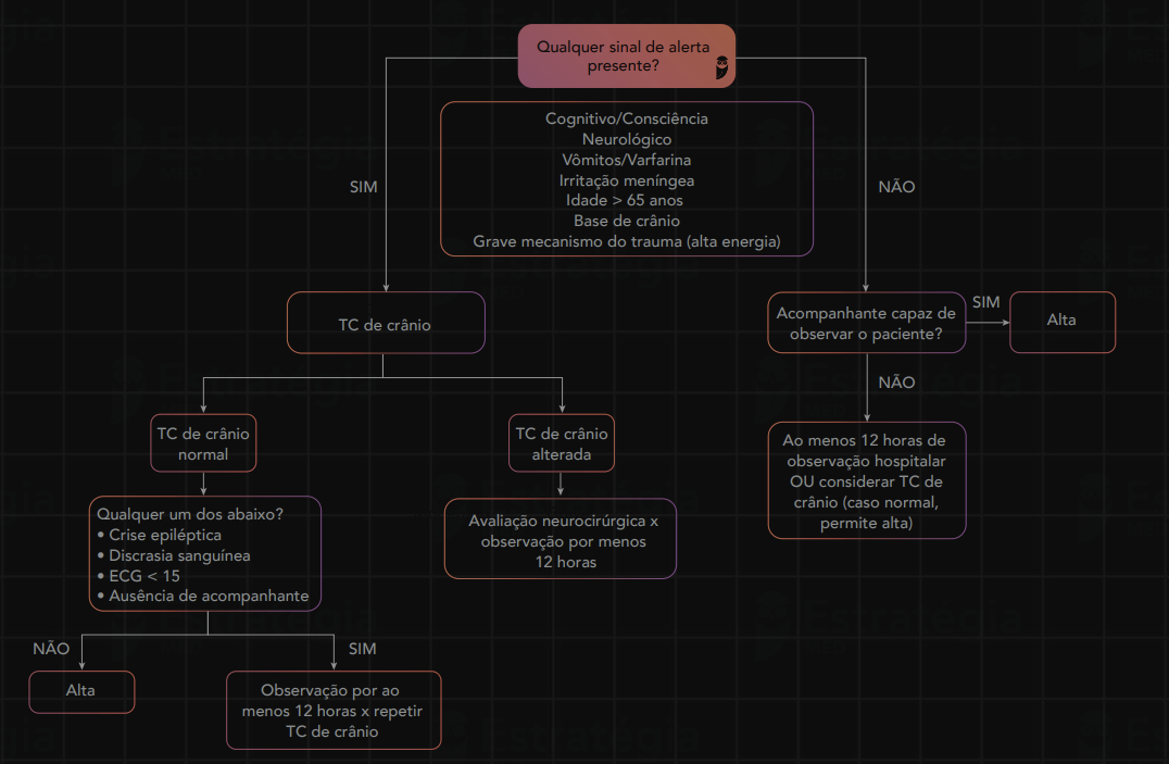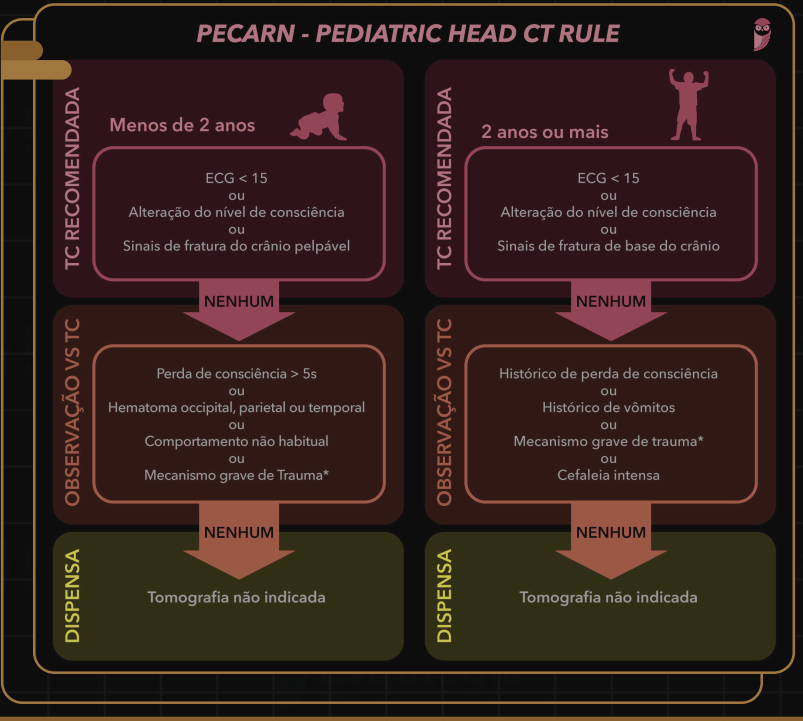 Seguir a regra PECARN: Para menos de 2 anos, TC recomendada se ECG <15, alteração do nível de consciência ou sinais de fratura do crânio palpável. Para 2 anos ou mais, TC recomendada se ECG <15, alteração do nível de consciência ou sinais de fratura de base do crânio. Há critérios para observação antes da dispensa/TC.
