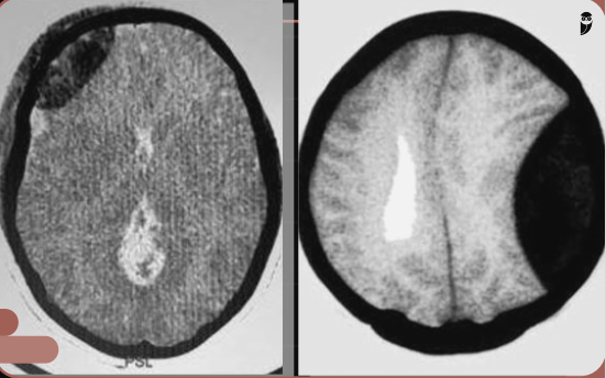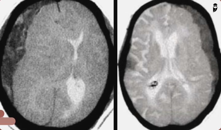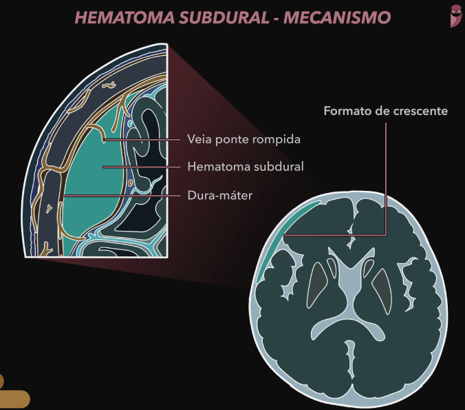 Ruptura da veia ponte (localizado entre a dura-máter e o córtex cerebral), apresentando formato de crescente na imagem.