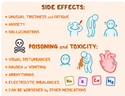dizziness, nausea and vomiting, palpitations, bradycardia, visual disturbances, confusion, and hyperkalaemia.