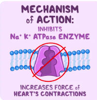 Inhibiting the Na+ K+ ATPase enzyme, also known as the sodium-potassium pump. This causes sodium to build up inside the heart cells, decreasing the ability of the sodium-calcium exchanger to push calcium out of the cells, consequently causing calcium to build up in the sarcoplasmic reticulum.