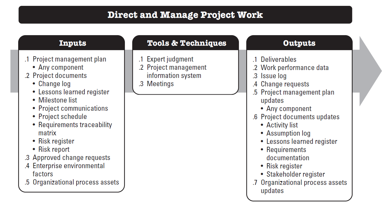 Direct and Manage Project Work is the process of leading and performing the work defined in the project management plan and implementing approved changes to achieve the project’s objectives. The key benefit of this process is that it provides overall management of the project work and deliverables, thus improving the probability of project success.