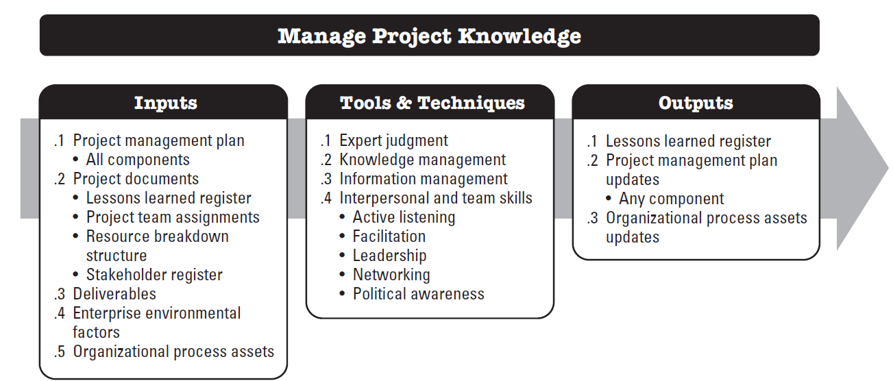 Manage Project Knowledge is the process of using existing knowledge and creating new knowledge to achieve the project’s objectives and contribute to organizational learning. The key benefits of this process are that prior organizational knowledge is leveraged to produce or improve the project outcomes, and knowledge created by the project is available to support organizational operates and future projects or phases.