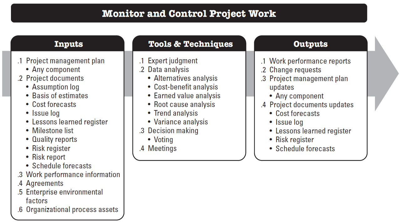 Monitor and Control Project Work is the process of tracking, reviewing, and reporting the overall progress to meet the performance objectives defined in the project management plan baselines. The key benefits of this process are that it allows stakeholders to understand the current state of the project, to recognize the actions taken to address any performance issues, and to have visibility into the future project status with cost and schedule forecasts.