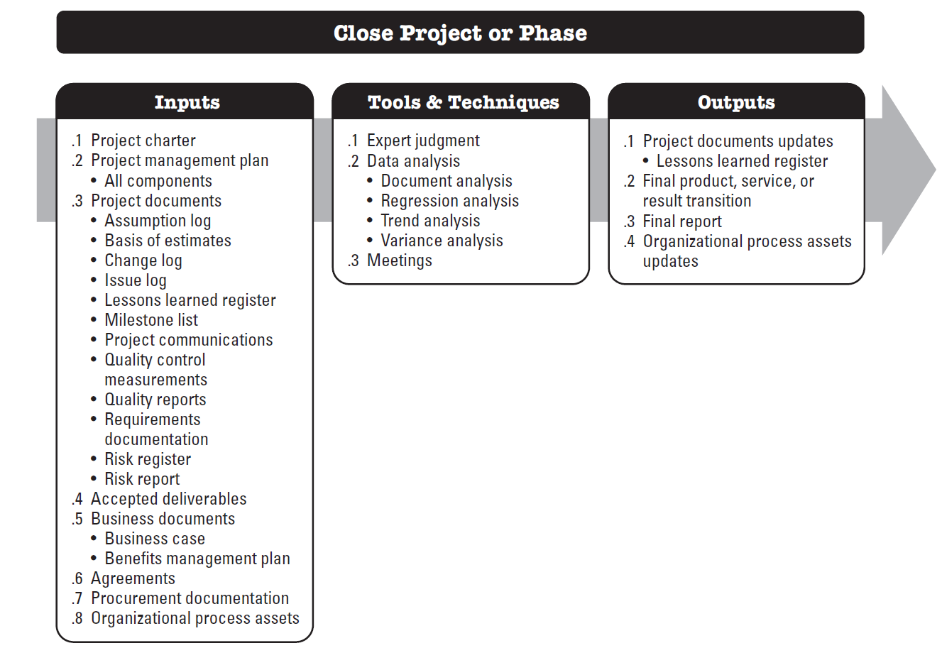 Close Project or Phase is the process of finalizing all activities for the project, phase, or contract. The key benefits of this process are the project or phase information is archived, the planned work is completed, organizational team resources are released to pursue new endeavors.