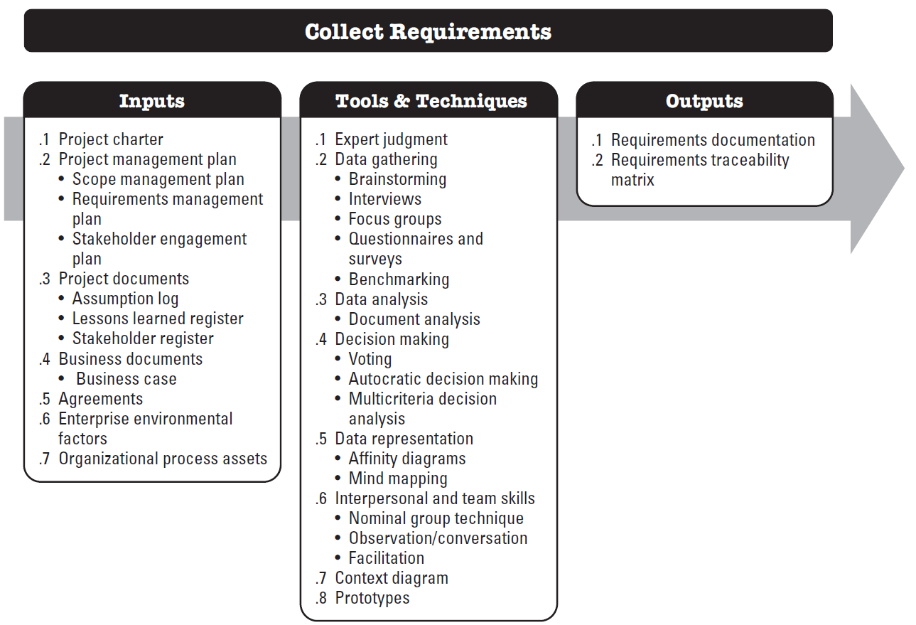 Collect Requirements is the process of determining, documenting, and managing stakeholder needs and requirements to meet objectives. The key benefit of this process is that it provides the basis for defining the product scope and the project scope. This is where you create the Requirements Traceability Matrix.