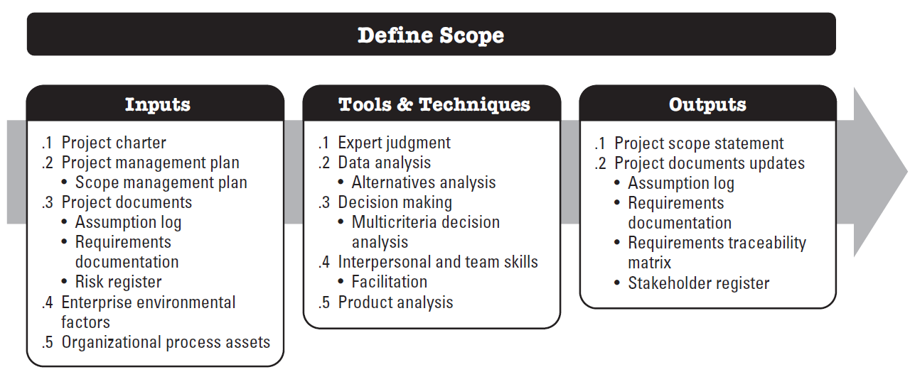 Define Scope is the process of developing a detailed description of the project and product. The key benefit of this process is that it describes the product, services, or result boundaries and acceptance criteria. This is developing the project scope statement.