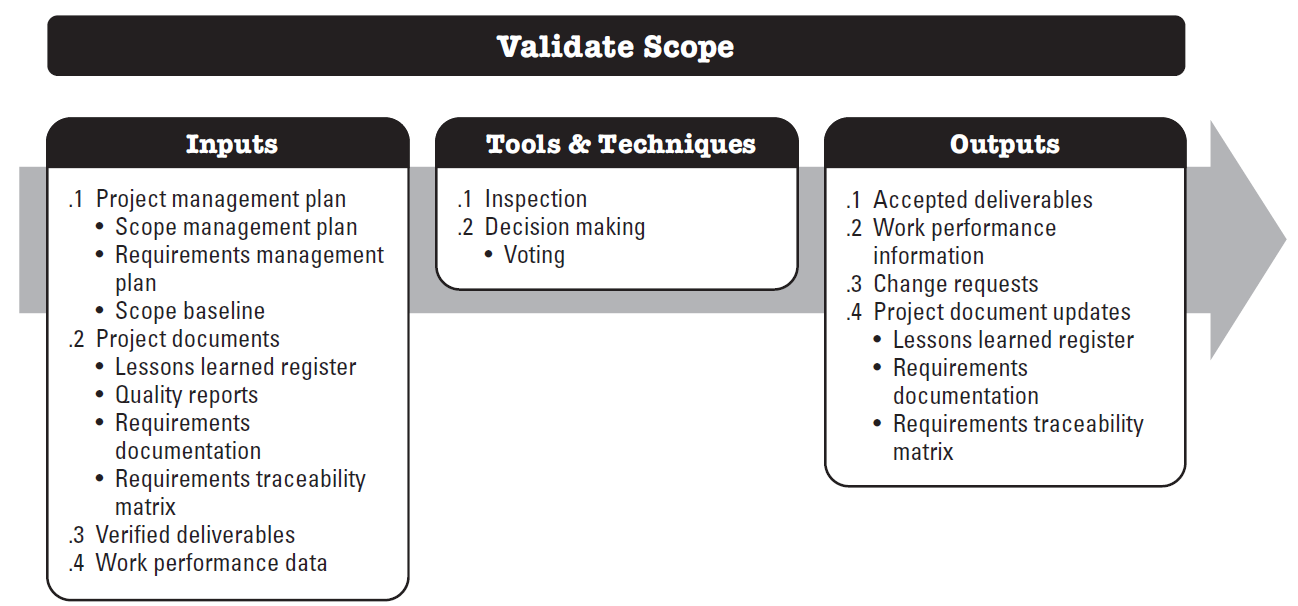 Validate Scope is the process of formalizing acceptance of the completed project deliverables. The key benefit of this process is that it brings objectivity to the acceptance process and increases the probability of final product, service, or result acceptance by validating each deliverable.