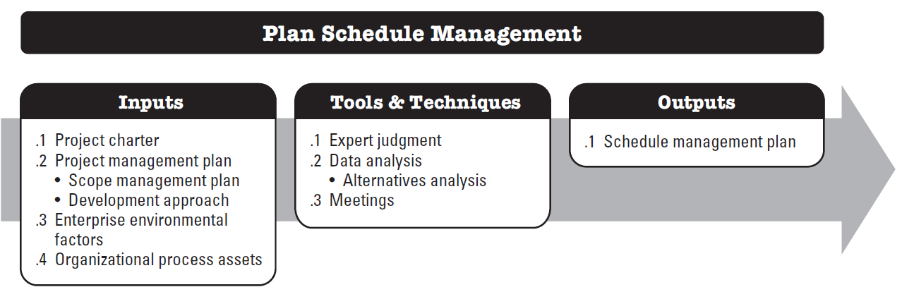 Plan Schedule Management is the process of establishing the policies, procedures, and documentation for planning, developing, managing, executing, and controlling the project schedule. The key benefit of this process is that it provides guidance and direction on how the project schedule will be managed throughout the project.
