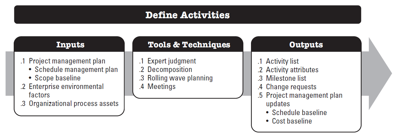 Define Activities is the process of identifying and documenting the specific actions to be performed to produce the project deliverables. The key benefit of this process is that it decomposes work packages into schedule activities that provide a basis for estimating, scheduling, executing, monitoring, and controlling the project work.