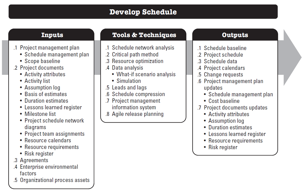 Develop Schedule is the process of analyzing activity sequences, durations, resource requirements, and schedule constraints to create a schedule baseline for project execution and monitoring and controlling. The key benefit of this process is that it generates a schedule with a baseline and planned dates for completing project activities.