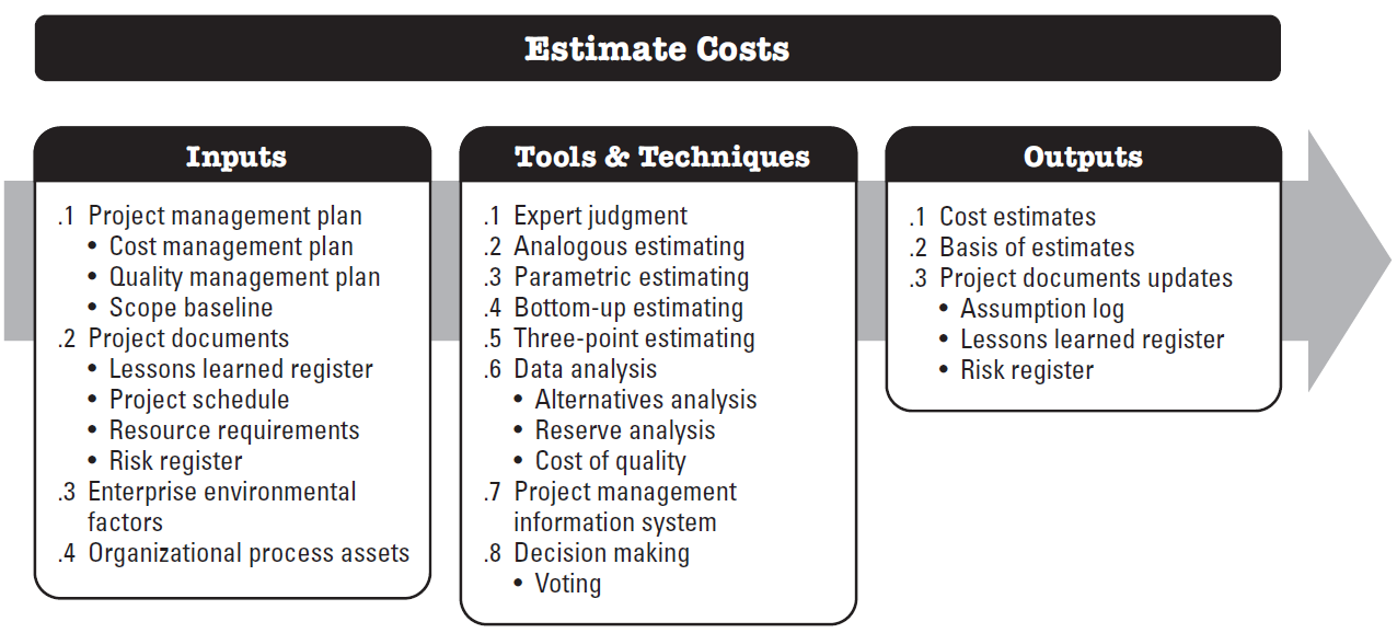 Estimate Costs is the process of developing an approximation of the cost of resources needed to complete project work. The key benefit of this process is that it determines the monetary resources required for the project.