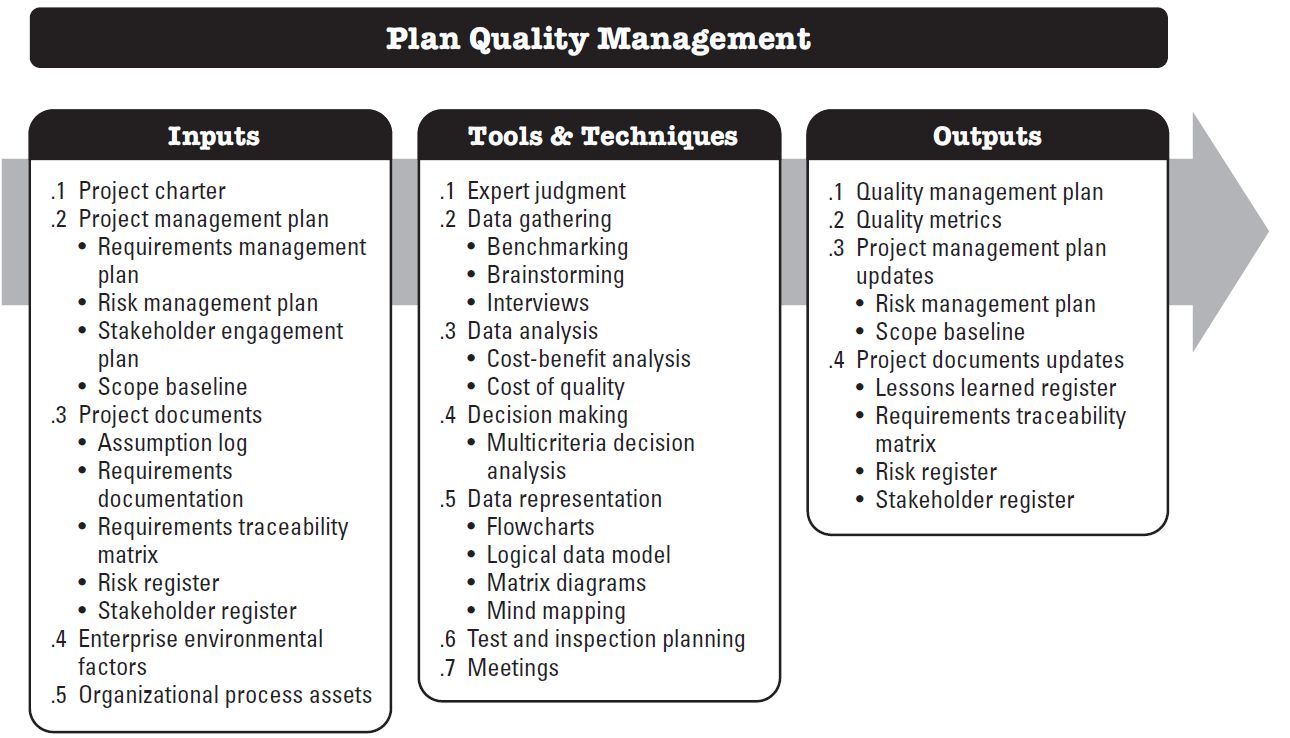 Plan Quality Management is the process of identifying quality requirements and/or standards for the project and its deliverables, and documenting how the project will demonstrate compliance with quality requirements and/or standards. The key benefit of this process is that it provides guidance and direction on how quality will be managed and verified throughout the project.