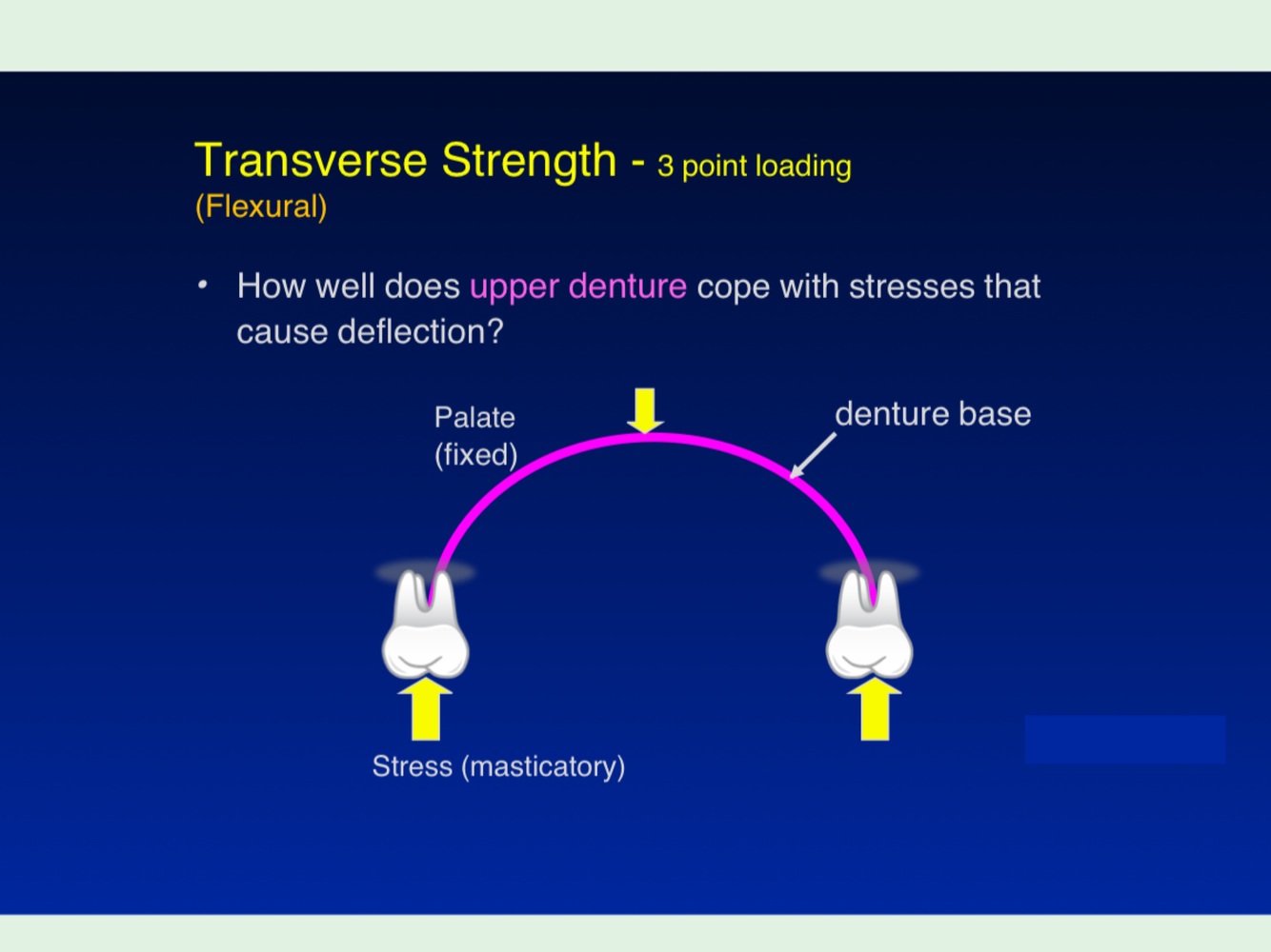 3 point loading of a denture. Pivot point is on the palate and there is masticatory stress on the teeth. Transverse strength is needed to stop the denture from fracturing.